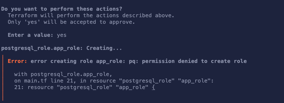 The first issue was a permissions error — admin_user couldn’t create Postgres roles. This issue was totally my fault — I hadn’t granted it any meaningful privileges. I had Cursor run terraform apply via the MCP, but it didn’t report back if the apply was successful. I think we’re in the very early stages of MCP workflows and usability concerns like surfacing logs and interpreting errors needs more attention to reduce friction.