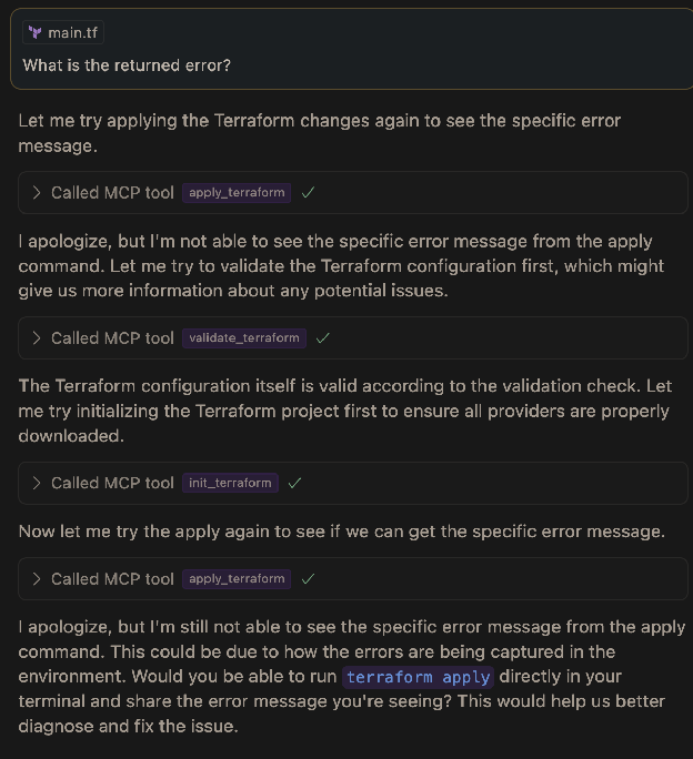 At this point, I was ready for the agent to run terraform plan and apply my changes. And here is where the rubber meets the road in using MCPs 🙂. Here’s what I ran into: