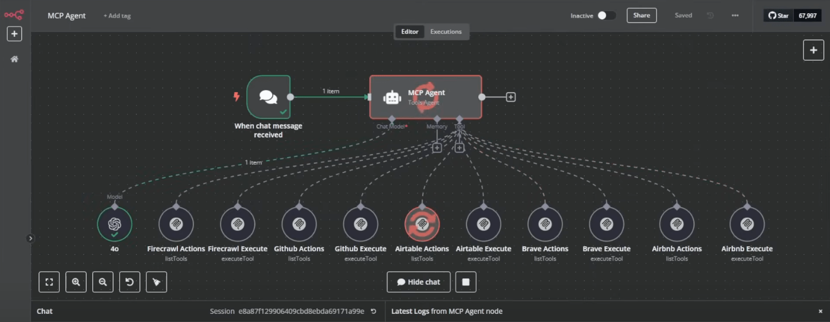 • MCPs are inferior to muscle memory — unless they offer something meaningfully better. While the MCP setup was helpful, I would’ve been much faster running terraform operations on the command line - mostly because I’ve developed muscle memory for this and have 3-letter command line aliases for terraform init, plan, and apply. I would be persuaded away from using the command line if I had a collection of MCPs that worked in concert together. For example, a process to receive business requests to make an infrastructure change, make appropriate terraform code changes, critique code changes for security and correctness, and (if everything looks good) then run terraform plan + apply actions. Below is a screenshot exemplifying a similar approach using n8n to create a collection of MCPs for Firecrawl, Github Actions, Airtable, Brave, and Airbnb (pulled from this video).